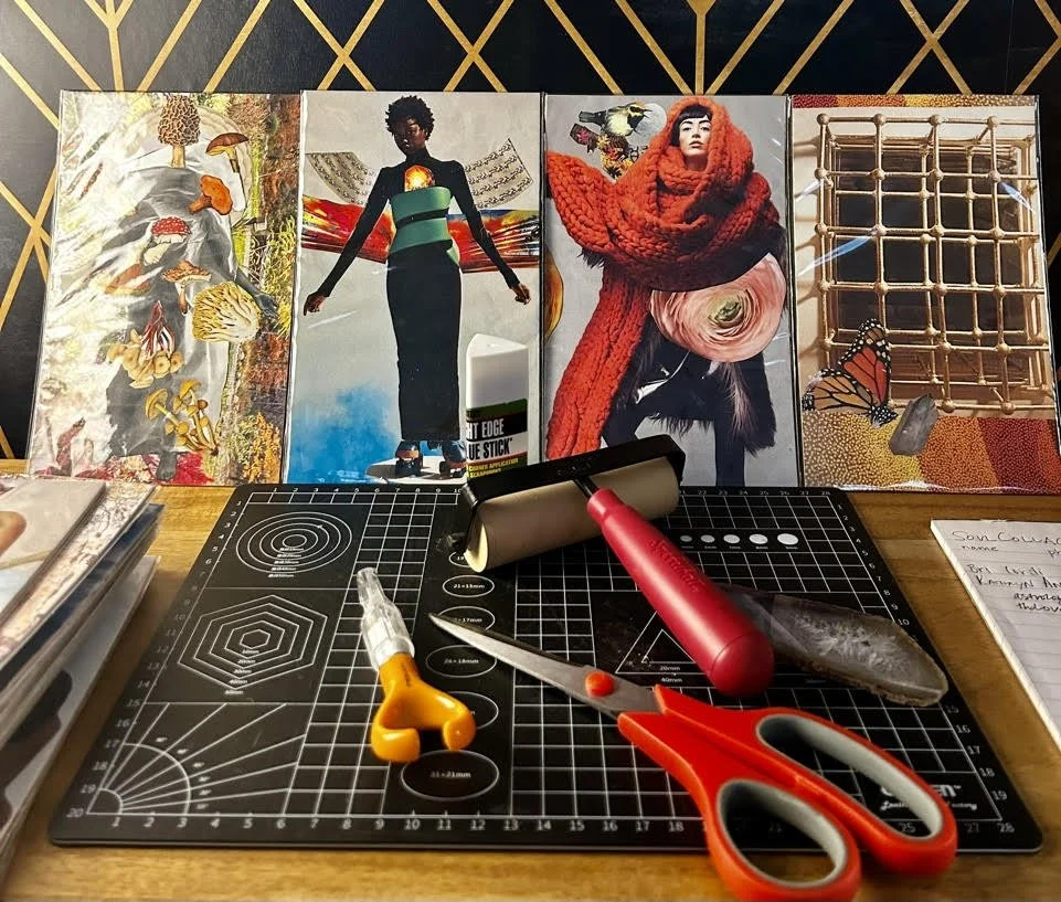 Participants often find that profound insights emerge. We make art. We voice and scribe for one another. Over time, building a stack of these collages becomes a life-long oracle deck generated from one's own interior.